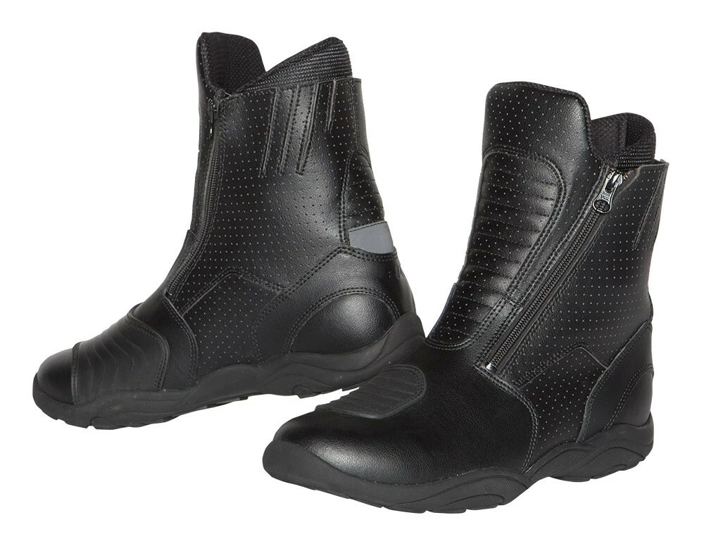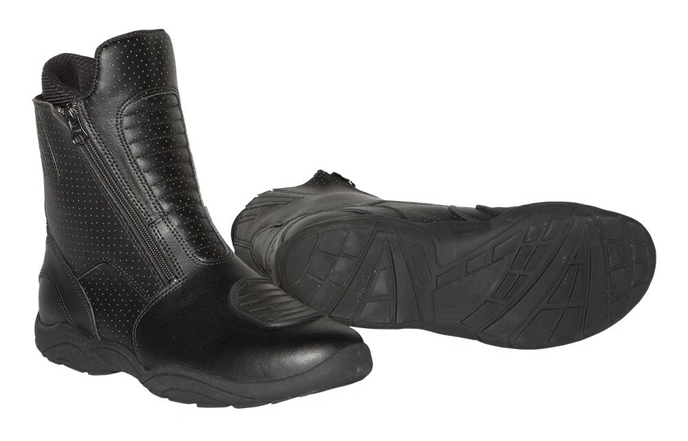 The BILT Pro Tourer Air Boots are a long distance touring boot that is ready for hot weather. The full cowhide construction is perforated and then fitted with a micro-mesh liner to wick moisture and facilitate airflow. A heavy duty sole is oil-resistant and packs a steel shank for durability, safety and cold morning kick-starts. Two YKK zippers run the length of the upper to make entry and exit a breeze. Stretch panels and zones of accordion flex provide the rider with a full range of motion on the bike while making the Pro Tourer Air Boots an equally capable companion when adventuring on foot.