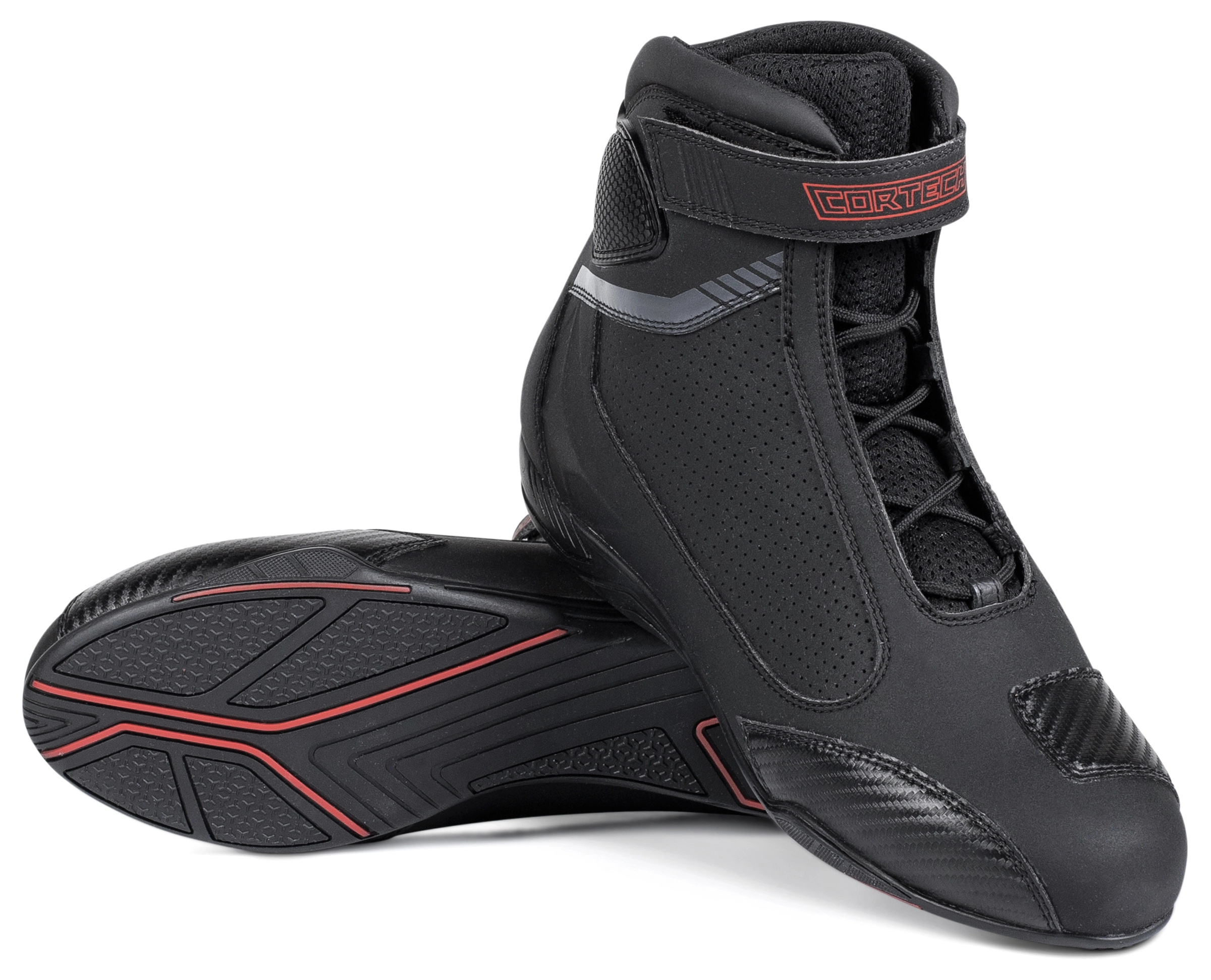 The Chicane Air Shoes from Cortech are a low profile, communicative riding shoe for summertime miles. The Chicanes are constructed from a perforated microfiber upper to enhance airflow. This durable, abrasion resistant material is fortified further with a thermoplastic heel cup, toe cap and carbon fiber-look shifter overlays. Molded into the shoes’ upper are dual density ankle protectors. Where the rubber meets the road is a unique midsole engineered with anti-twist and unidirectional flex properties. A reflective patch at the heel adds visibility in low light, and a hook and loop ankle strap keeps loose laces from unsavory mingling with moving parts. Designed with an emphasis on “sport”, the Chicane Air Shoes’ thin outer sole and svelte toe box are primed to work the foot controls.
