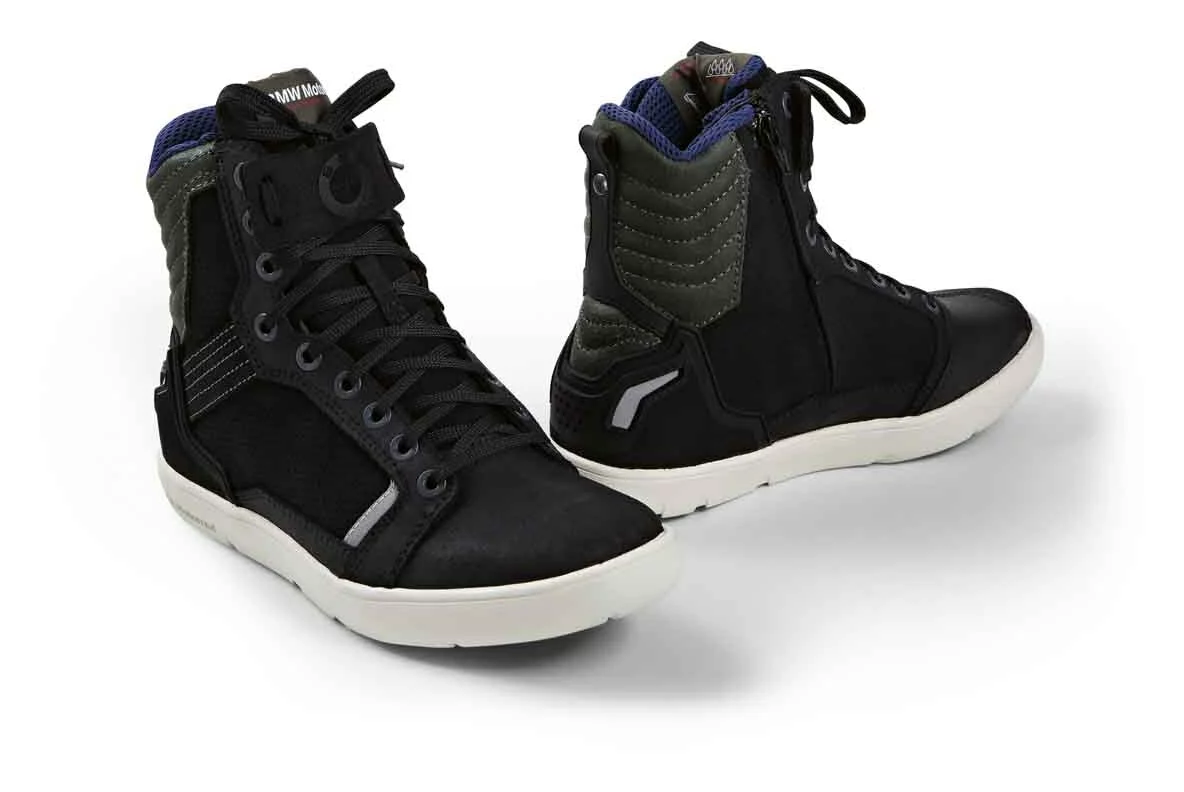 The BMW Dry Sneakers are a waterproof riding shoe that can pass for a standard sneaker. Reinforcement at the heel and toe along with a stiff sole help to protect your feet while riding. Traditional laces are held in place with a lace cover while a medial side zipper makes it easy to slide these shoes on and off.