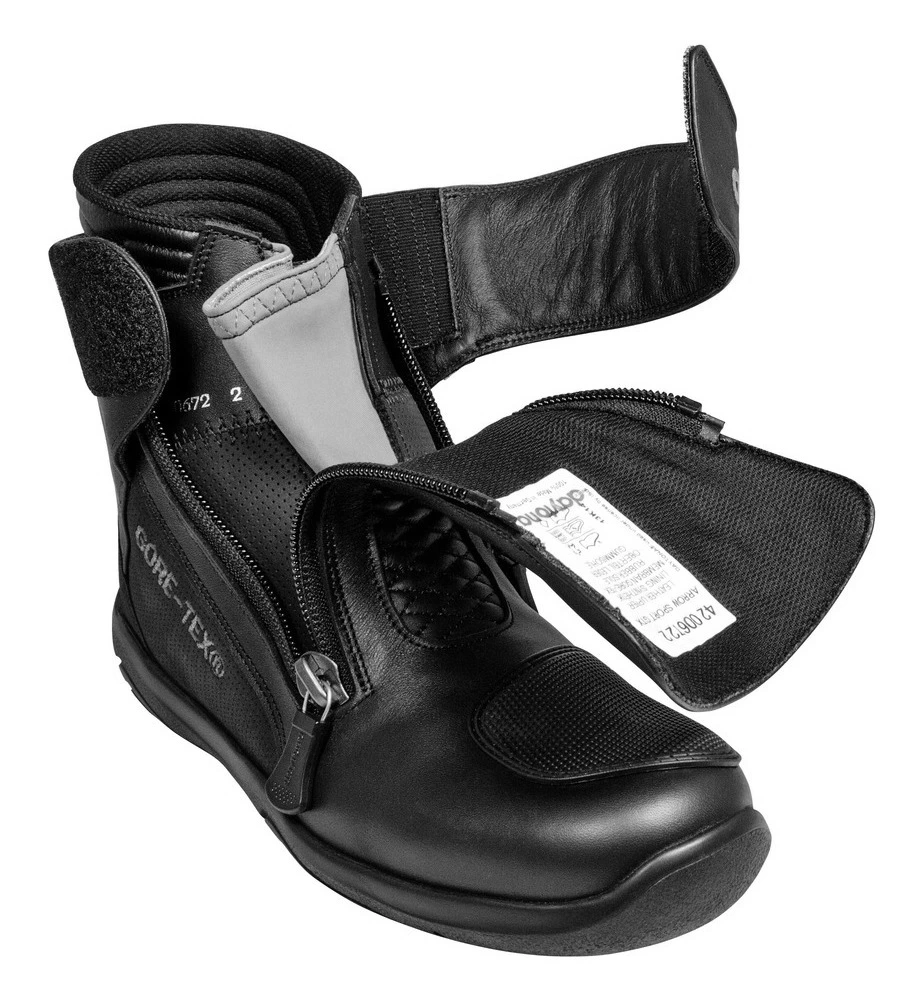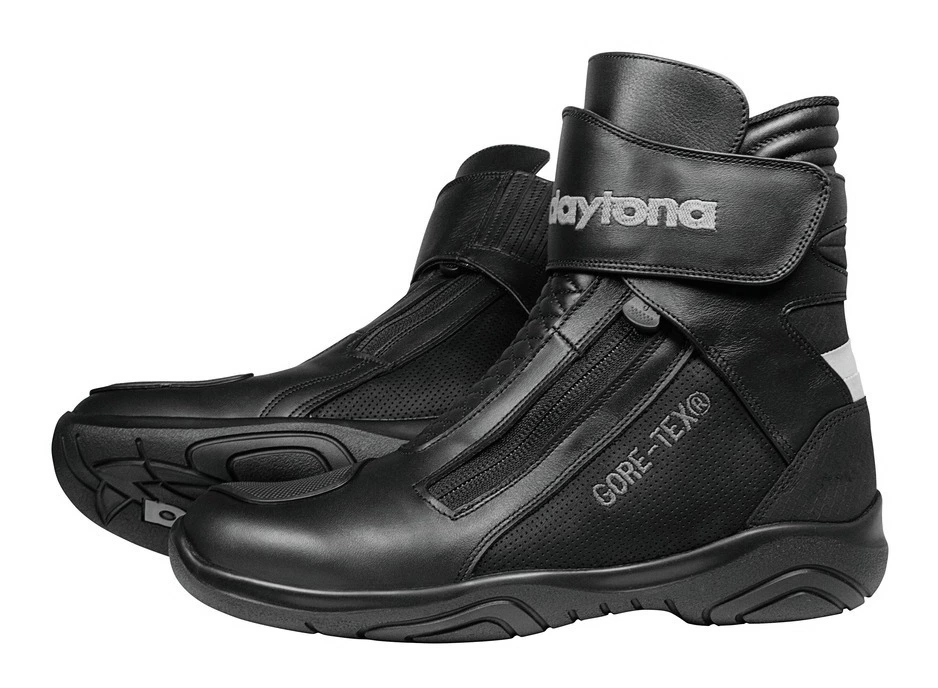 Cut from the same cloth as the unequivocal Daytona Road Star GTX Boots, the Daytona Arrow Sport GTX Boots take aim squarely for the heart of the performance-minded all-weather touring rider. Encompassing the best ergonomic and technical features of their full-shafted touring compatriot, including the invaluably convenient dual zip entry, the Daytona Arrow Sport Boots have a shaft height similar to your favorite hiking boot and comfort to match without sacrificing protection. Padded ankle and shift guards and a carefully-engineered combination steel and plastic insert in the sole ensure the safety features do not get in the way of mile-devouring performance, walking and shifting flexibility.