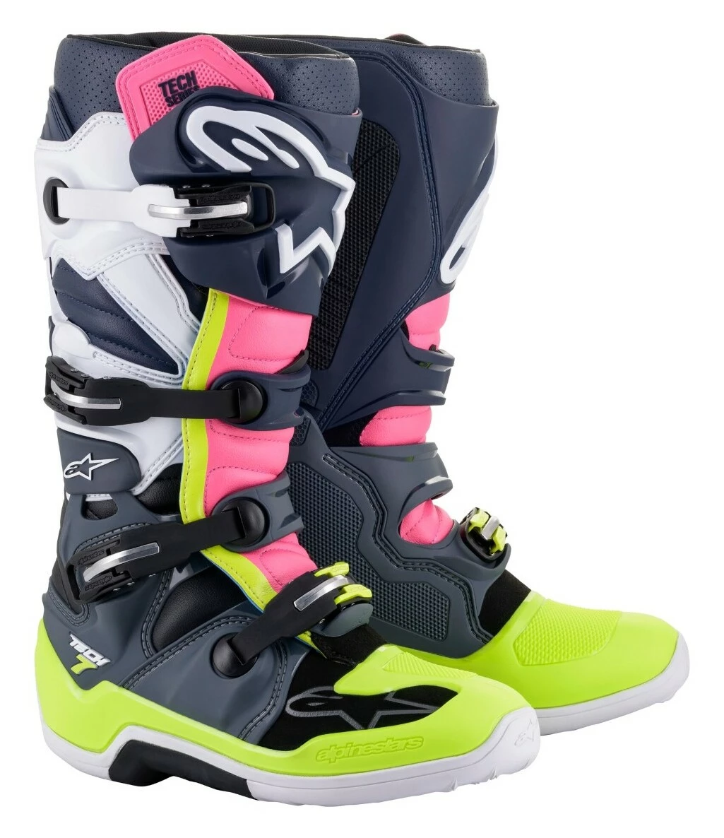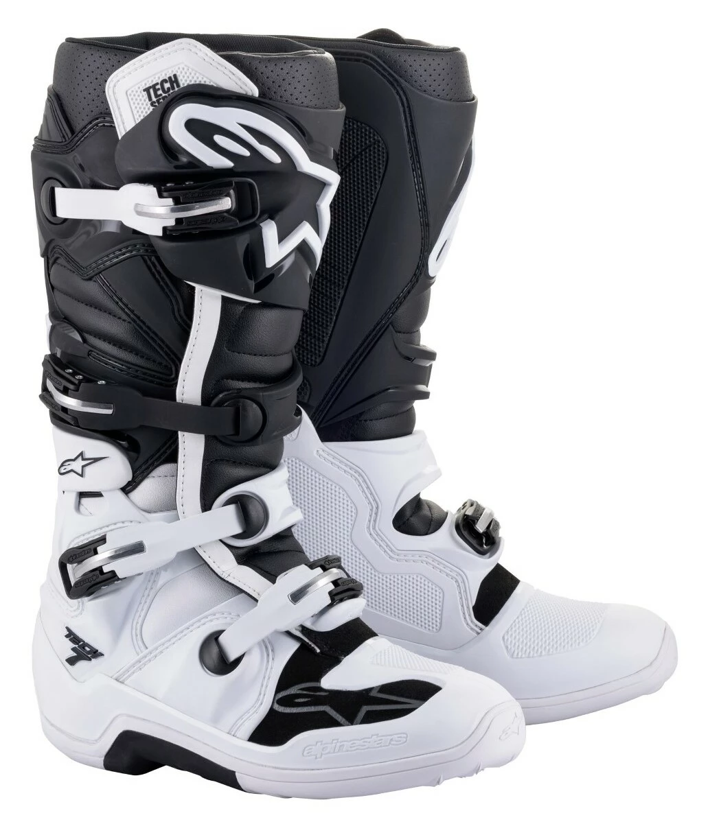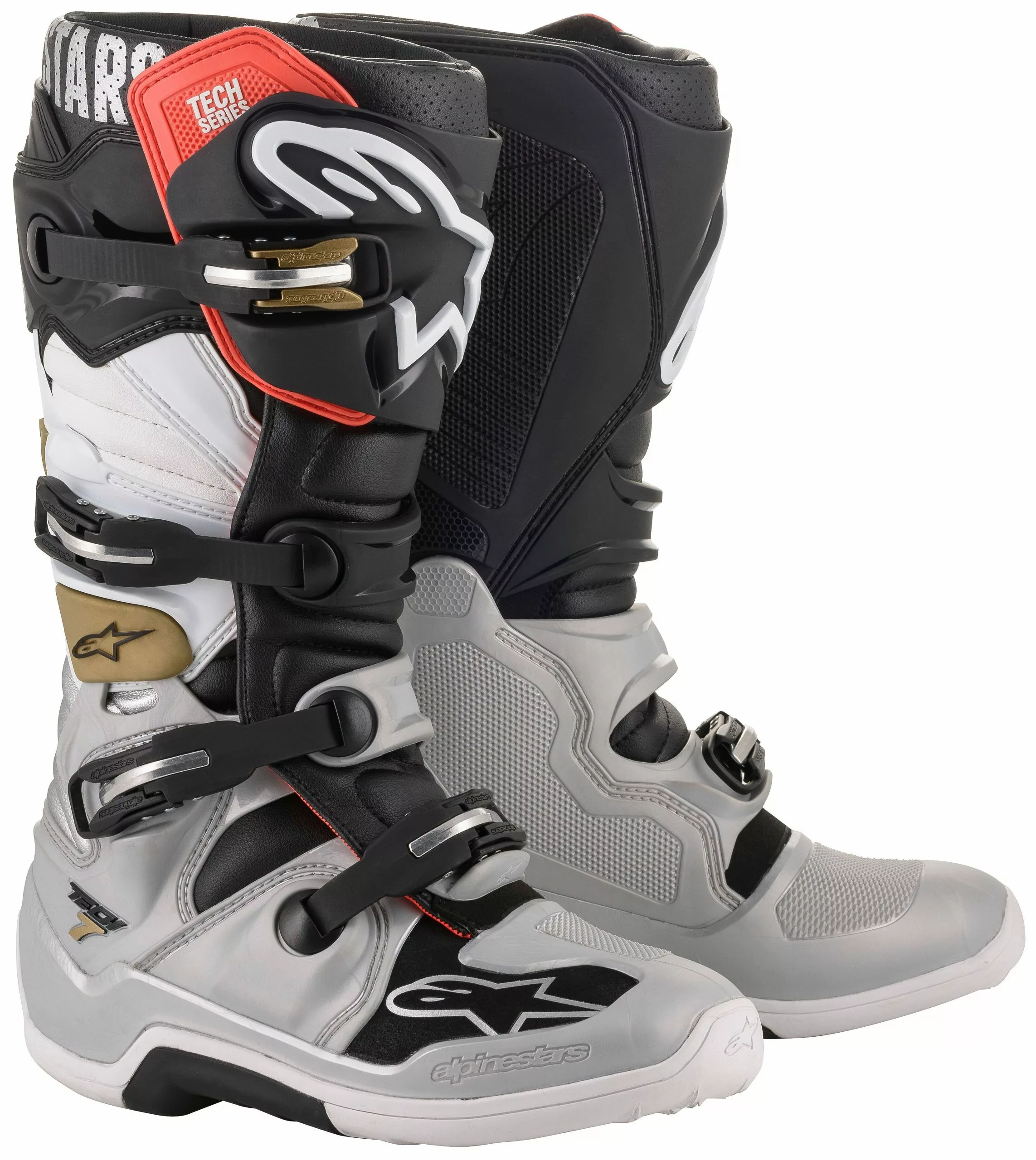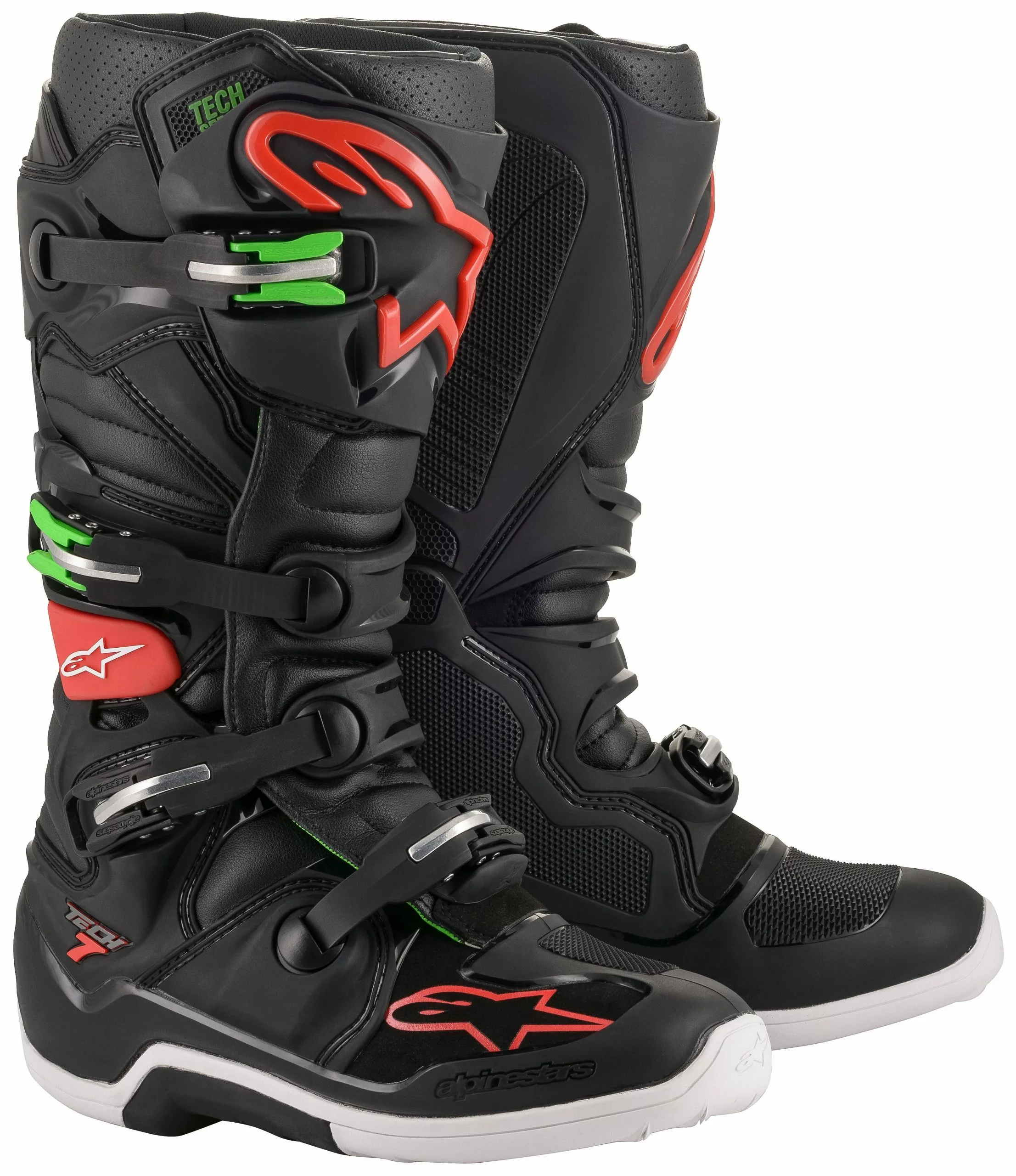 The Alpinestars Tech-7 Boots feature an upper constructed from light, innovative microfiber that is flexible and abrasion resistant. Innovative, evolutionary TPU shin-plate construction for greater range of fitment features a reinforced VELCRO® brand closure for comfortable, highly customized closure. The shin zone incorporates a TPU blade system engineered to prevent frontal hyperextension and offer greater flex control. Wide entry aperture for convenience with VELCRO® brand upper closure TPR flap to allow broad ranging calf fit adjustment and support. Medial-facing area is constructed from one-piece TPU panel with honeycomb sculpturing for maximum grip contact with bike and improved heat and abrasion resistance. Top rear flexion of the boot is supported around the calf by an innovative TPU sliding blade system which dissipates the friction.
