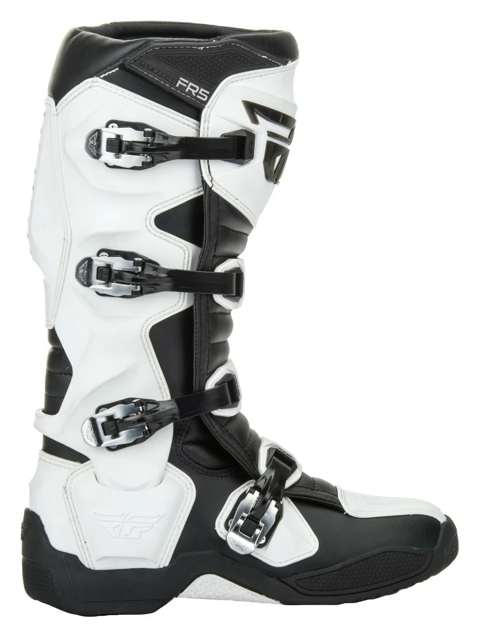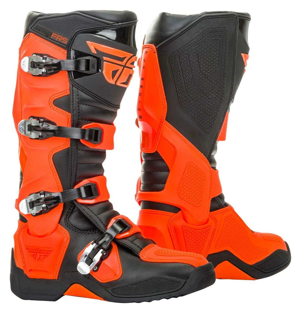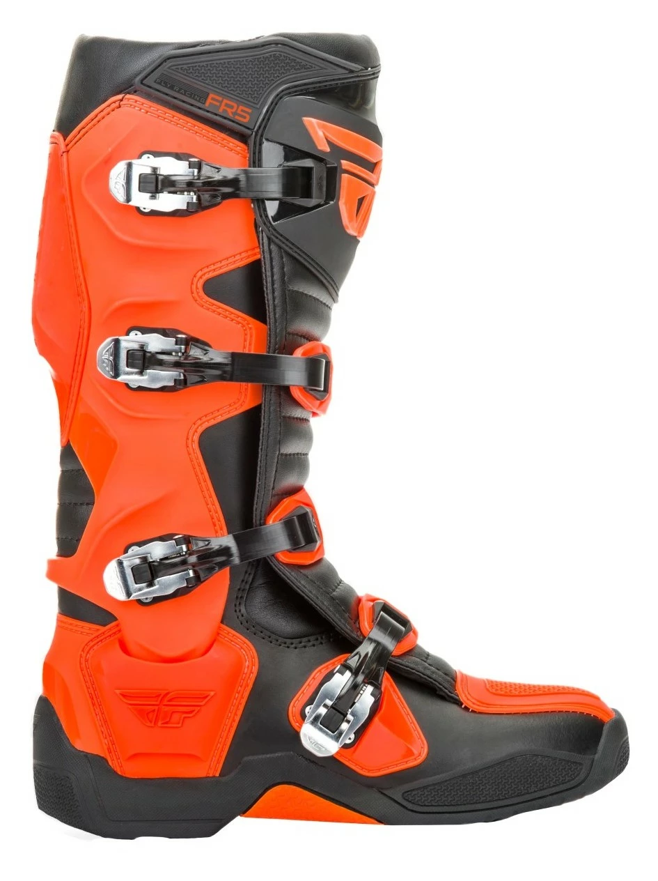 The Fly Racing Dirt FR5 Boots are the next step in protection from Fly Racing. The FR5 Boots provide full coverage thanks to the TPU (thermoplastic polyurethane) heel piece which connects lateral and medial TPU pieces, as well as the contoured TPU calf plate. Additionally, they employ a brand new 4-stage high-grip sole design that is ready to race your stiffest competition. Stage one is a perforated plush insole resting above the innovative second stage, an injected midsole with a unique fishbone design which is lightweight yet incredibly strong. The durable mid-sole is then further enhanced by the addition of a rigid in-mold flex reducing steel shank. Stage three is a fishbone foam layer designed to transfer shock and vibration which is then encased in the final stage, an anti-vibration molded traction sole.