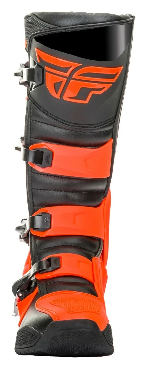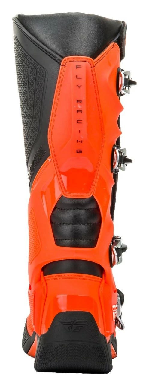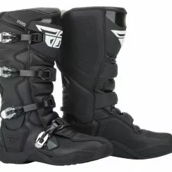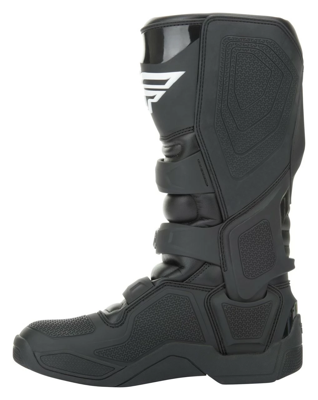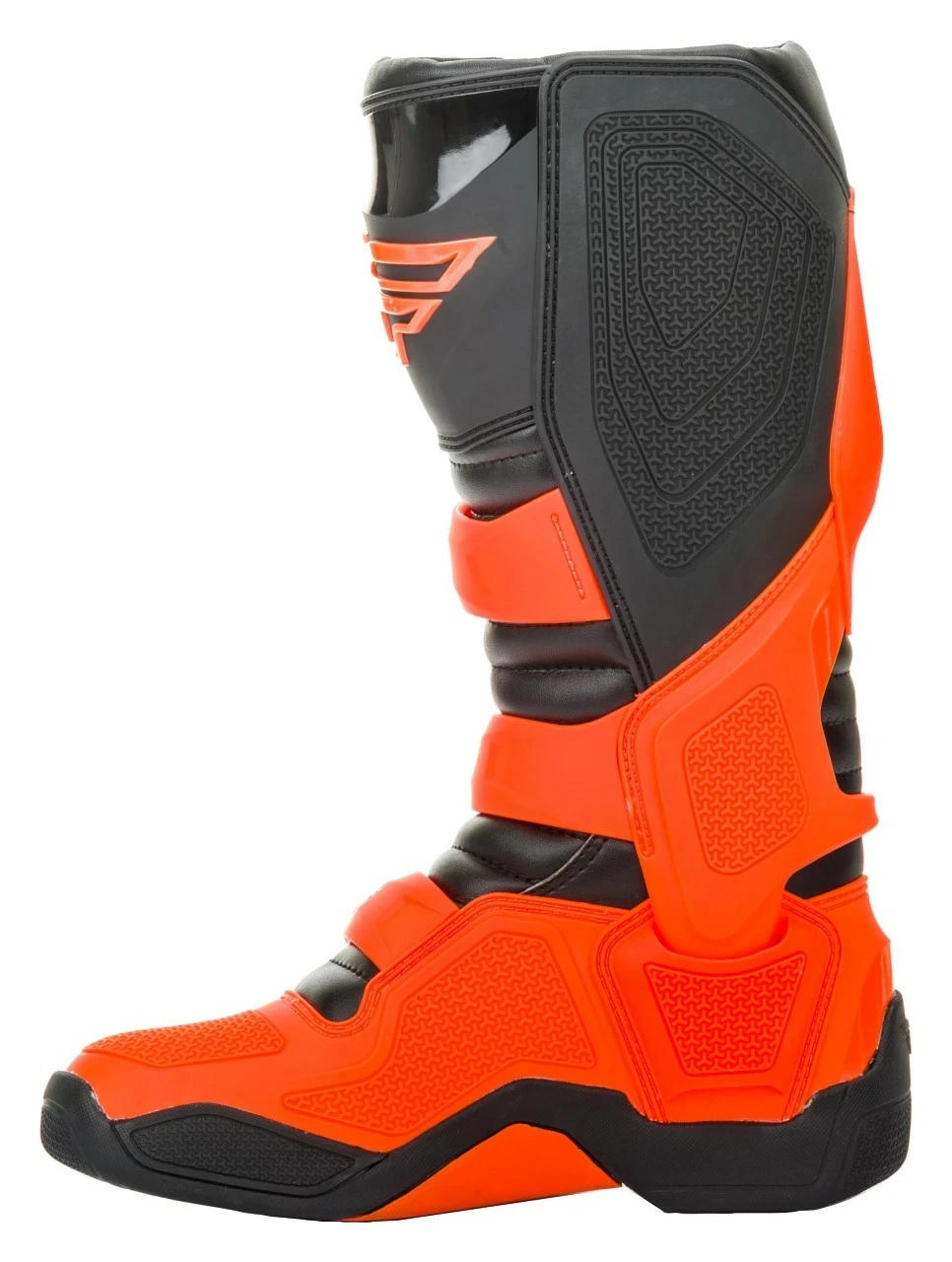 The Fly Racing Dirt FR5 Boots are the next step in protection from Fly Racing. The FR5 Boots provide full coverage thanks to the TPU (thermoplastic polyurethane) heel piece which connects lateral and medial TPU pieces, as well as the contoured TPU calf plate. Additionally, they employ a brand new 4-stage high-grip sole design that is ready to race your stiffest competition. Stage one is a perforated plush insole resting above the innovative second stage, an injected midsole with a unique fishbone design which is lightweight yet incredibly strong. The durable mid-sole is then further enhanced by the addition of a rigid in-mold flex reducing steel shank. Stage three is a fishbone foam layer designed to transfer shock and vibration which is then encased in the final stage, an anti-vibration molded traction sole.