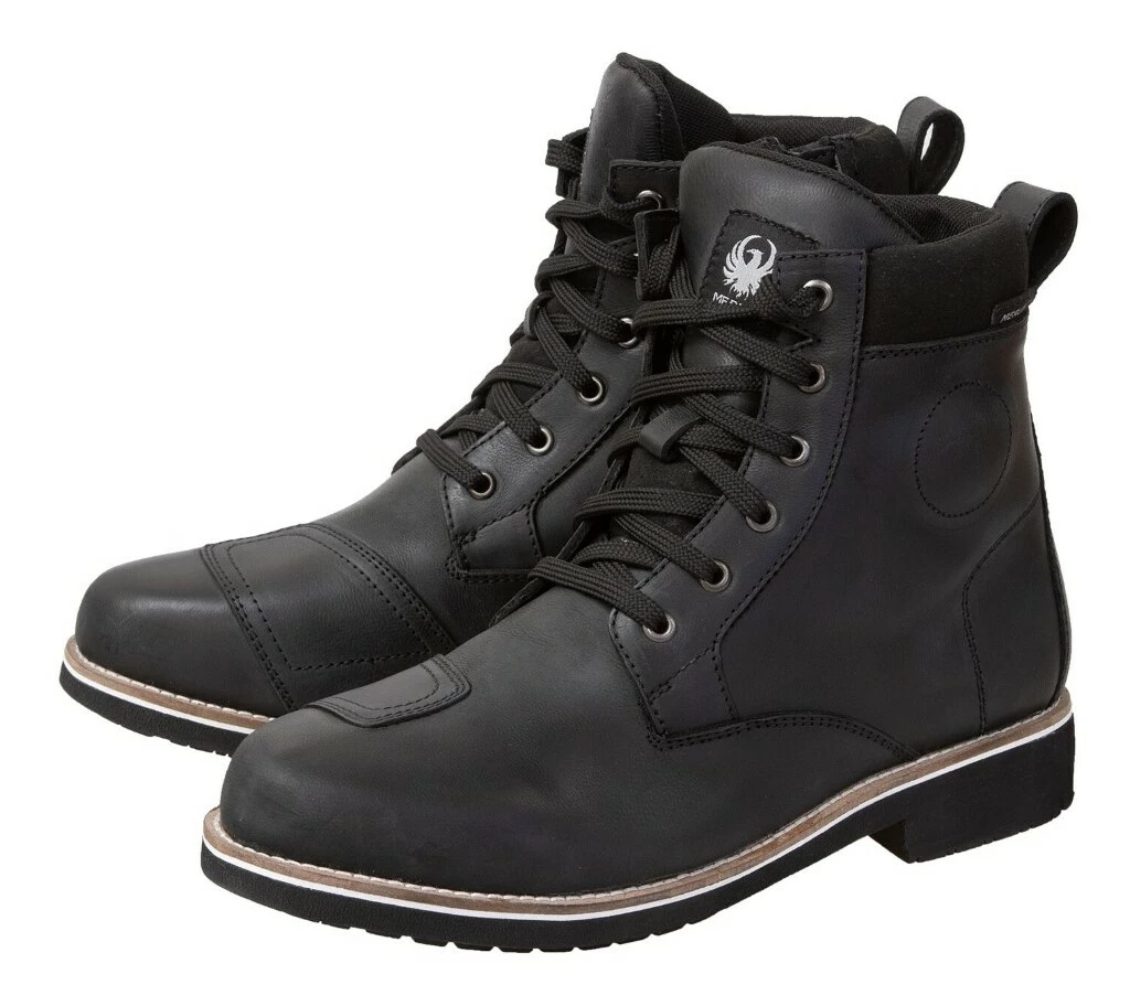 The Merlin Ether Boots are a round toe riding boot with a waterproof liner and symmetric shifter pad overlays. These go-anywhere boots use full grain cowhide over a reinforced heel, ankle and toe box. The sturdy foot bed is CE rated, and D3O impact absorbing inserts are placed around the ankle for protection.