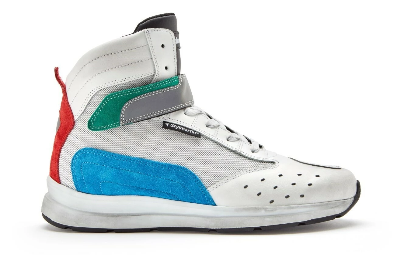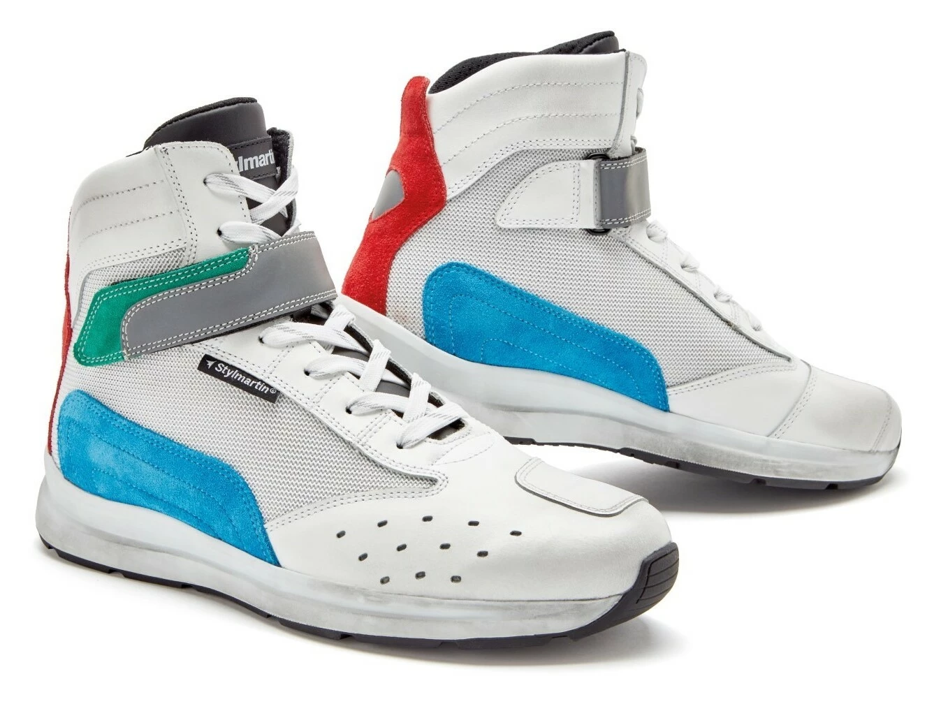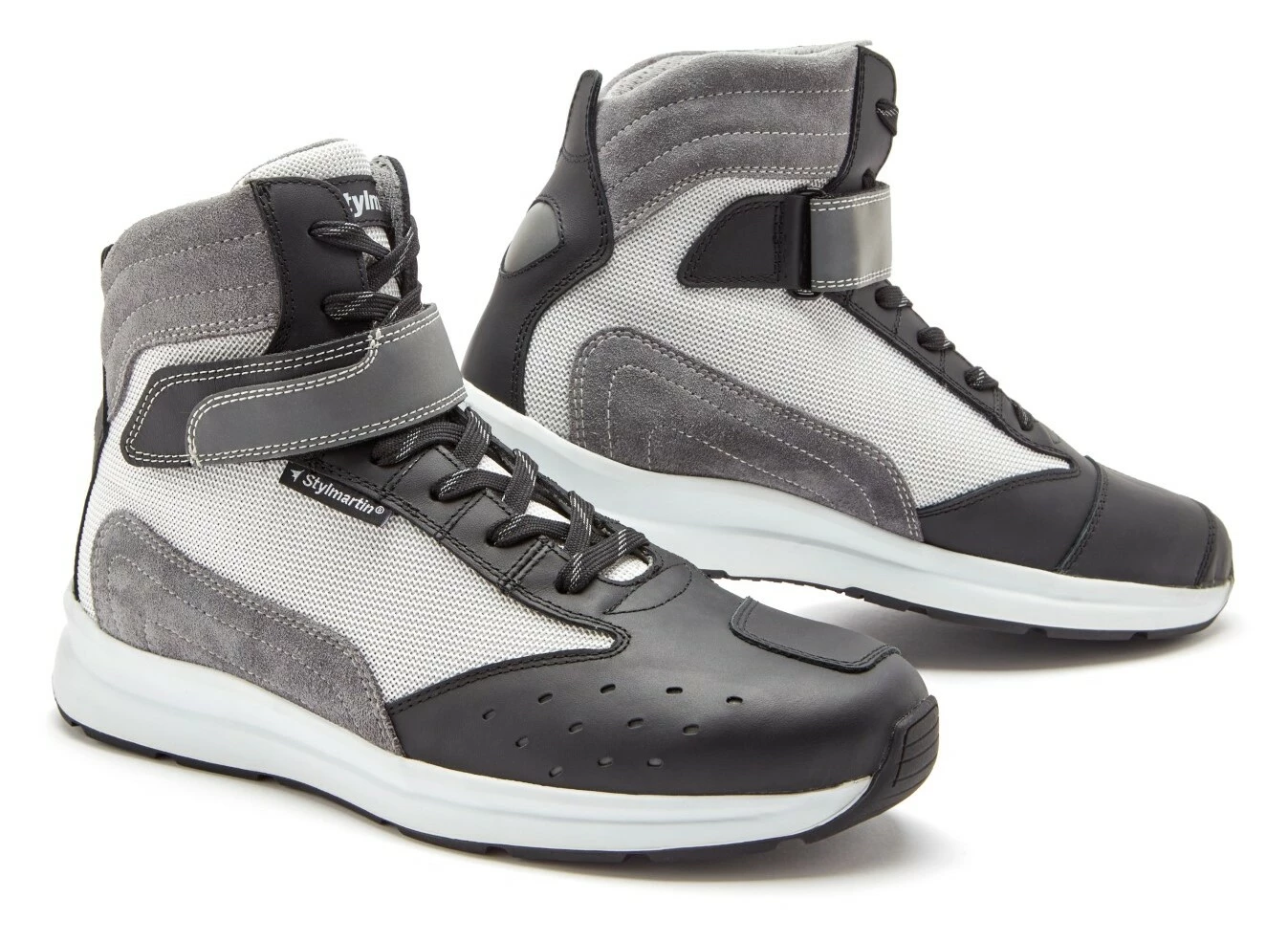 The Stylmartin Audax Air Riding Shoes are the high tops for the sneakerhead motorcyclist. A leather, suede and fabric upper give the appearance of an old school high top. Perforation is incorporated into the shoe for airflow and also used as a new element of style – with oversized holes for airflow at the toe. A hook and loop closure at the ankle secures laces and ensures the Audax Airs stay strapped no matter how unwieldy you are on your hoverboard.