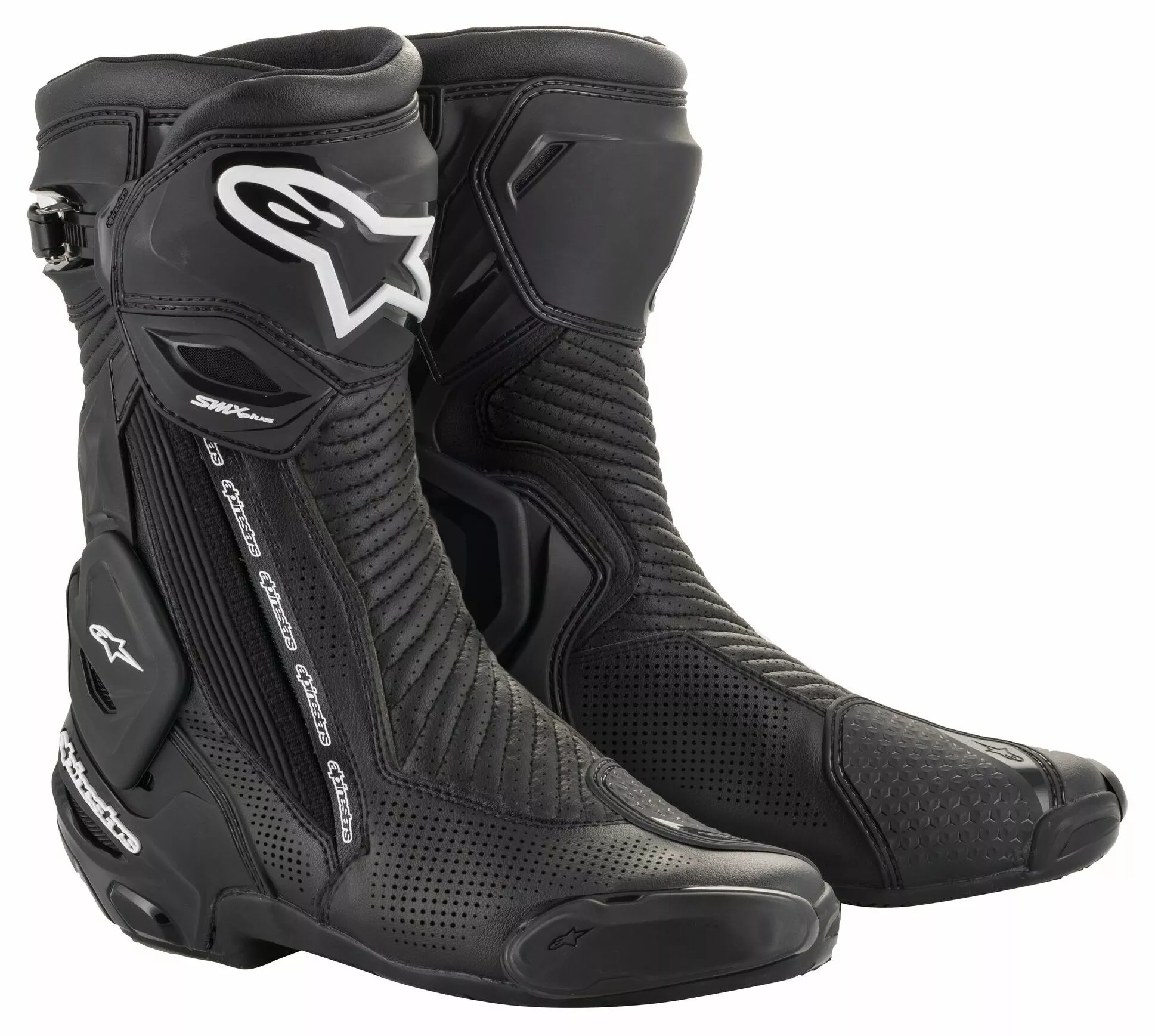 The Alpinestars SMX Plus V2 Vented Boots are the next generation of the popular SMX Plus line, known for track day performance and protection. A high shin plate helps guard against impacts from your foot pegs. Ankle protection comes in the form of Alpinestars’ signature Multi-Link Control system that helps keep your ankle from moving in ways it is not supposed to while still giving you enough range of motion to operate foot controls. A wide heel counter wraps around the back of your foot with shock absorbing padding. A replaceable heel slider keeps you moving in the event of a crash. Accordion stretch zones at key areas provide flexibility and improved fit. Perforation throughout the boot with strategic vents in TPU help flow air to your feet. With replaceable parts and protective design, the Alpinestars SMX Plus v2 Boots will be a reliable track boot for many seasons.